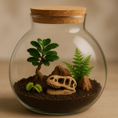 Terrarium : Plongez votre intérieur dans une ambiance préhistorique avec ce terrarium Jurassique, où la végétation s’étend autour d’un crâne fossile pour recréer l’atmosphère tropicale d’une époque disparue. Chaque plante a été soigneusement sélectionnée pour offrir une scène vivante, dense et immersive, rappelant les paysages d’un monde ancestral. Assemblé à la main, chaque exemplaire est unique : la disposition, les textures et les volumes varient selon les éléments choisis. Cet écosystème autonome nécessite très peu d’entretien et évolue au fil du temps, faisant de chaque terrarium une pièce vivante et durable.